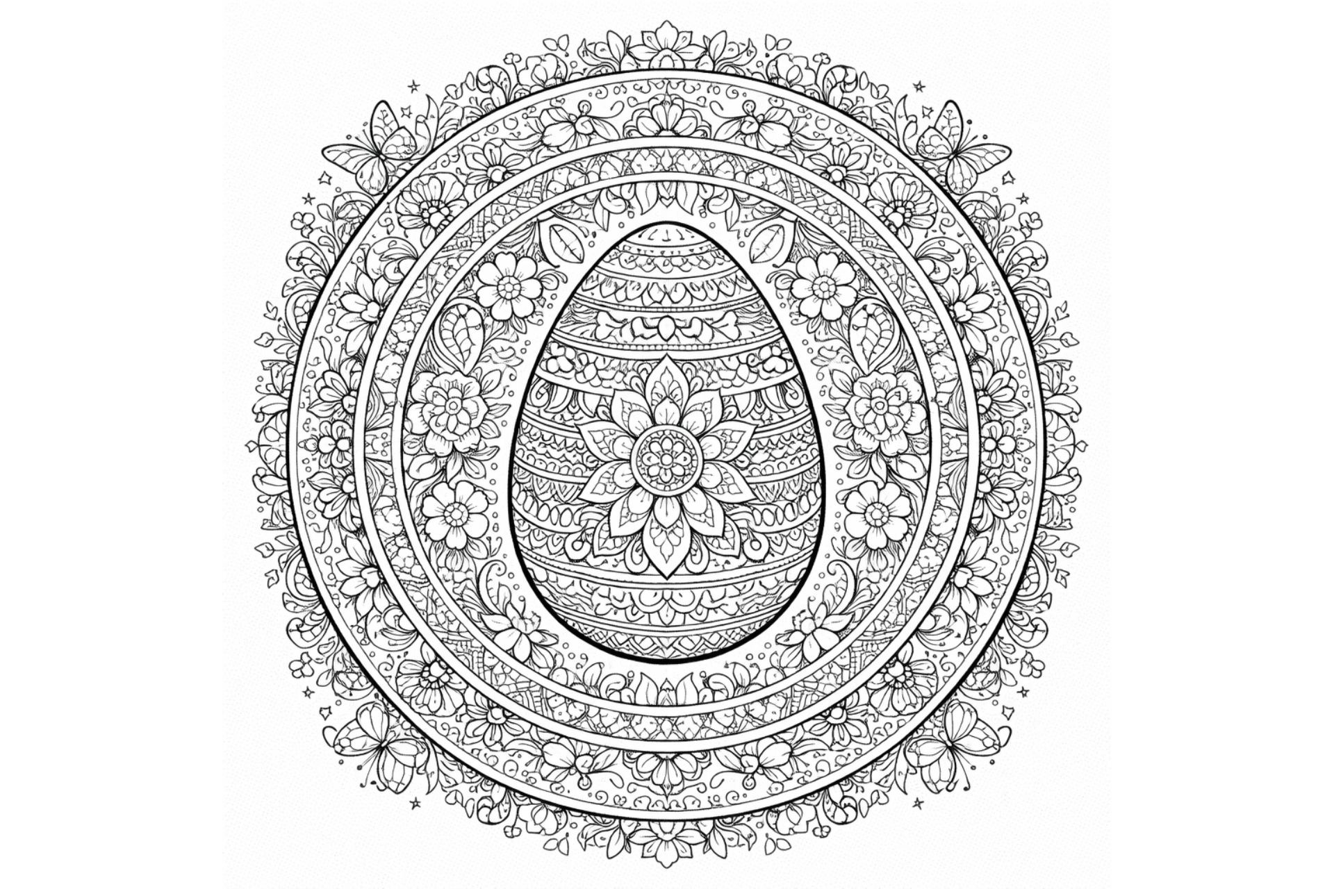 Um das zentrale Ei herum verläuft ein breiter Mandala-Kreis mit dekorativen Ornamentringen. Diese bestehen aus wiederkehrenden Blütenformen, Sternmustern, kleinen Punkten und geschwungenen Linien. Die Muster sind gleichmäßig verteilt und spiegeln sich rund um das Zentrum.