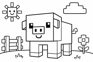 Dieses Ausmalbild zeigt einen fröhlichen Hund in einer einfachen Blockwelt-Landschaft. Der Hund steht groß und gut sichtbar im Mittelpunkt des Bildes und hält oder bewacht einen großen Knochen. Dazu sieht man nur wenige weitere Elemente: eine Blume, einen Baum, etwas Gras, eine Wolke und eine lachende Sonne. Genau diese klare und ruhige Gestaltung macht das Motiv besonders passend für kleine Kinder ab 2 Jahren, die erste Erfahrungen mit dem Ausmalen sammeln.