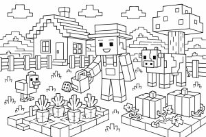 Dieses Ausmalbild zeigt eine spannende Szene tief unter der Erde in einer blockigen Abenteuerwelt. In der Mitte steht eine freundliche Figur mit einer Spitzhacke in der Hand. Daneben sieht man eine Lore auf Schienen, kleine Pilze, einen leuchtenden Laternenblock, funkelnde Kristalle und sogar eine kleine Fledermaus an der Decke. Das Motiv ist klar aufgebaut und bietet viele spannende Details, ohne zu überladen zu wirken.